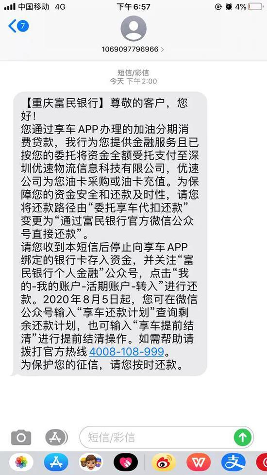 8月7日,本人收到富民银行发来的短信提示,还款路径变由“委托享车代扣还款”变更为“通过富民银行直接还款”。可见,富民银行不但不处理问题,反而要求用户直接向其还款。这样一来,本人不敢不还款,投诉无门,征信出现了污点。