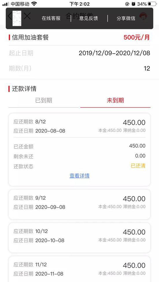 8月9日,董先生在聚投诉平台发帖称,本人通过享车平台办理合约加油业务,即每月9日享车平台向本人加油卡充值500元,次月9日本人按约定向享车平台还款450元,合约期限自2019年12月9日至2020年12月9日。