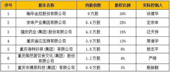 公开资料显示,富民银行成立于2016年8月,是经中国银监会常态化审批成立的第一家民营银行。富民银行由瀚华金控、宗申集团、福安药业、渝江压铸、海特环保、陶然居和博恩科技重庆7家优秀的民营企业共同发起设立,注册资本30亿元,具体股东及持股情况如下表: