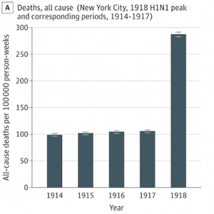 对此,来自布莱根妇女医院的Jeremy Faust领导了一支队伍展开了研究。其比较了COVID-19爆发前两个月纽约市的额外死亡人数以及疫情最严重两个月内纽约市的相同数据点。通过分析计算出,在西班牙流感大流行的高峰期,纽约市每10万人中有287人死亡。相比之下,在3月和4月COVID-19高峰期间,该市每10万人死亡人数为202。西班牙流感显然比COVID-19更致命,看起来好像是这样对吧?--然而事实并非如此......