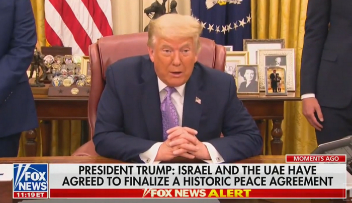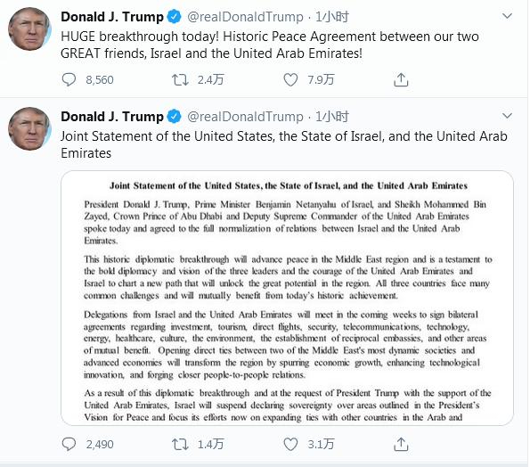 8月13日,美国总统特朗普在推特上发文宣布,在他本人居中斡旋下,以色列和阿联酋达成一项历史性和平协议,标志着两国关系将全面正常化。