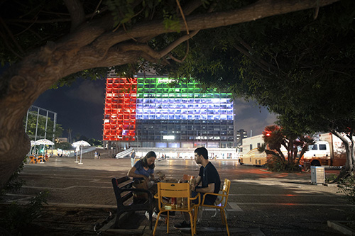 以色列特拉维夫市政厅的灯光打出阿联酋和以色列的国旗。