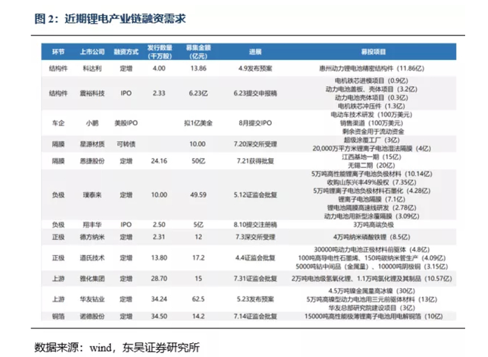 目前,产业链有多家锂电相关公司有融资需求。根据上述东吴证券整理出来的数据,12家产业链相关企业计划融资263亿元,远超过宁德时代190亿元的投资金额。