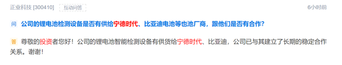 正业科技则直接表示公司的锂电池智能检测设备有供货给宁德时代、比亚迪,公司已与其建立了长期的稳定合作关系。