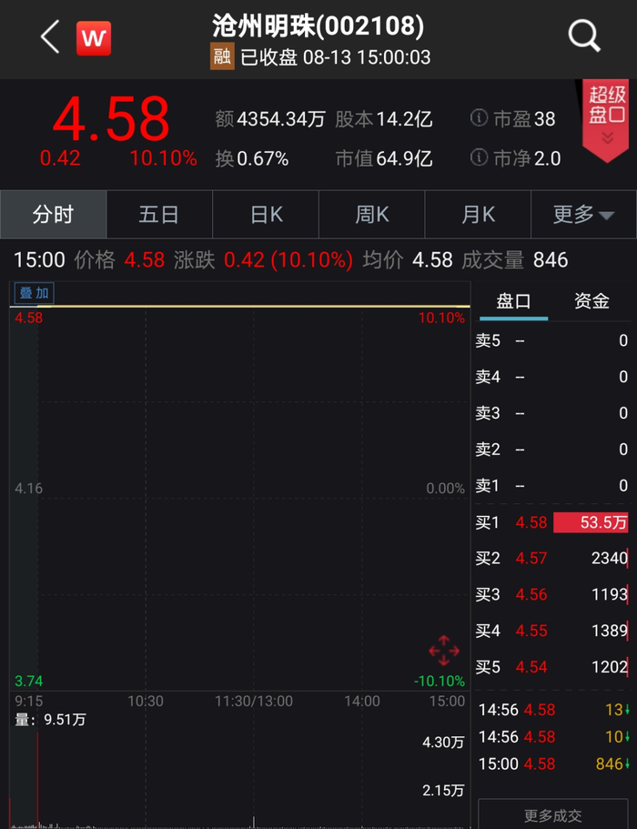 然而,当日沧州明珠开盘仍然一字涨停直至收盘,收报4.58元。