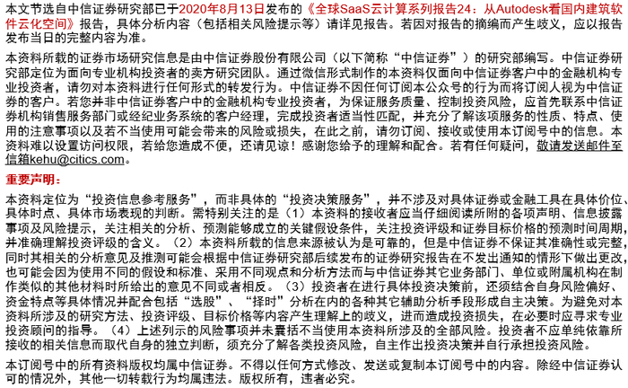 作为全球CAD、建筑设计等软件市场领导者,Autodesk仅用时不足5年,即完成从传统license模式向订阅模式全面转型,转型后,公司业绩稳定性、成长性、盈利能力等指标亦显著改善。2015年之前,Autodesk超过50%的收入主要来自于license售卖,同时公司主要营收来源集中于建筑等行业,具有典型顺周期特征,license为主收入结构+建筑行业特征,使得公司收入增速受宏观经济波动影响较为明显。Autodesk的转型实践,以及在建筑等垂直领域的布局思路,对于目前渗透率仍处较低水平的国内建筑信息化市场,以及部分积极向云端迁移的代表性企业来说,具有明显借鉴意义。