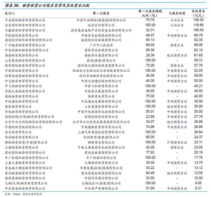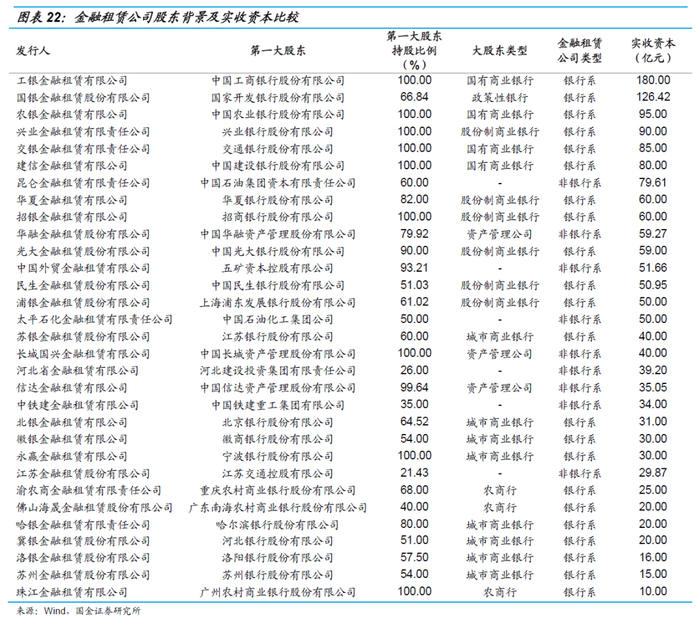 金融租赁公司的大股东一般为商业银行、资产管理公司和大型企业集团,具有雄厚的资金实力。资本金排名前列的金融租赁公司以银行系股东背景的居多,且大多为全国性商业银行,其业务规模庞大、盈利能力强、辐射范围广;排名靠后的金融租赁公司股东多为地方性商业银行,其在业务规模和辐射范围等方面不及全国性商业银行,但在所在地具有一定的区域优势;非银行系金融租赁公司的资本金实力大多位于行业中等水平。整体来看,银行系金融租赁公司在股东背景、资本金实力上更具有优势。