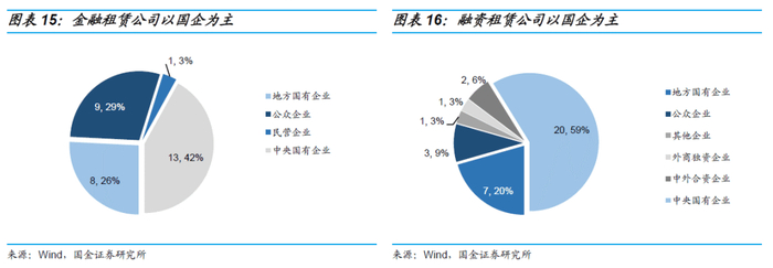在公司属性上,无论是金融租赁还是融资租赁公司,均以国企为主。金融租赁公司为国企的比例为68%,其中央企占比42%;融资租赁公司中,国企占比达79%,其中央企占59%,存在1家外商独资企业和2家中外合资企业。