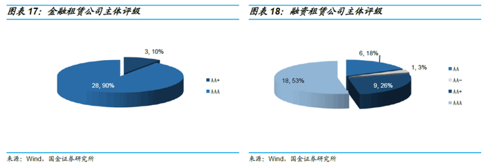 在主体信用评级上,金融租赁公司以AAA评级为主,占比90%,其余为AA+评级,整体主体评级较高;融资租赁公司中AAA、AA+、AA、AA-评级占比分别为53%、26%、18%和3%。整体来看,金融租赁公司主体评级情况优于融资租赁公司。