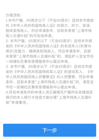 申请人查看在“随申办”移动端渠道办理的相关须知内容,了解该事项的相关办理条件。如:申请人须为本市户籍人员,须年龄满18周岁且持有本市批准发放的《中华人民共和国残疾人证》等。