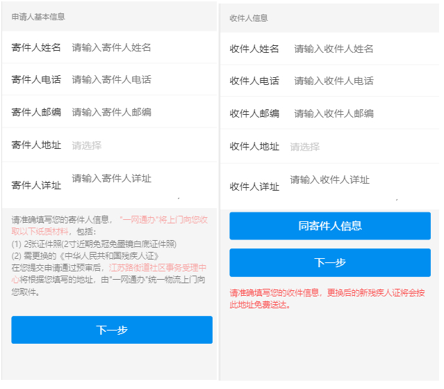 收件人信息用于确保“一网通办”统一物流准确提供上门配送服务。审批通过后,新换领的《中华人民共和国残疾人证》将由“一网通办”统一物流专员根据收件人地址上门配送(服务免费)。