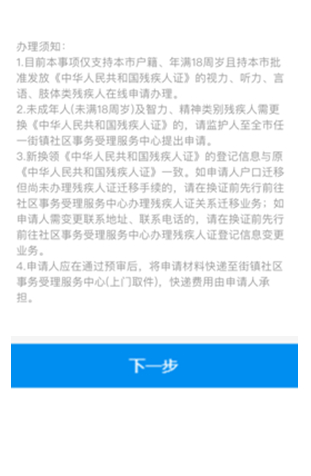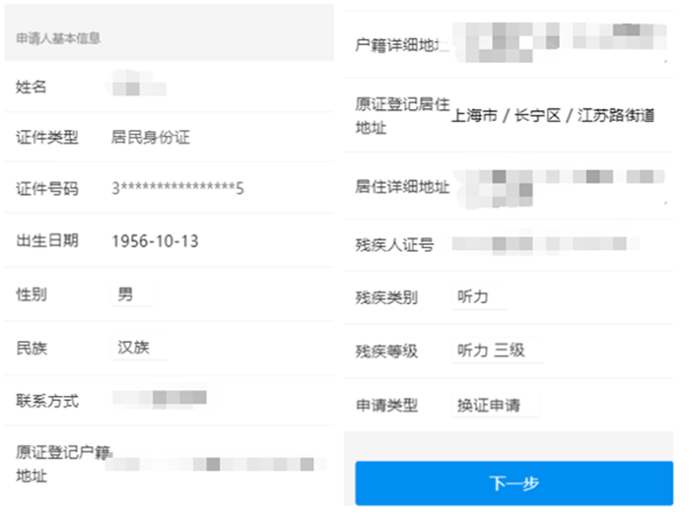 申请人确认联系方式、原证登记户籍地详细地址、原证登记居住详细地址等基本信息以及残疾类别、残疾等级等相关信息,确认无误后点击下一步继续办理。