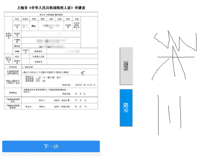 申请人确认上海市《中华人民共和国残疾人证》申请表,确认无误后进行手写电子签名确认。