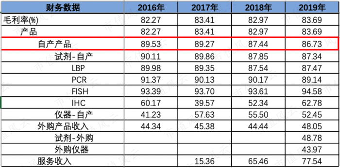 试剂毛利率也比仪器毛利率高很多:2019年自产试剂毛利率为87.34%,自产仪器毛利率为52.45%。