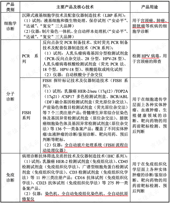 根据公司披露,LBP产品系列(含“安必平”、“达诚”和“复安”三个品牌产品)和PCR(HPV荧光18型和28分型)均主要用于宫颈癌筛查,这两大产品线占了营业收入的70%以上。