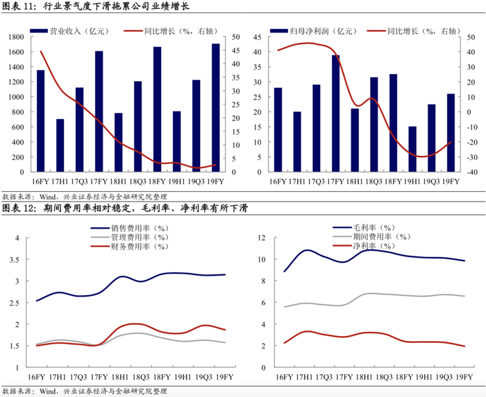 2019年全年公司实现营业收入/归母净利润1704.56/26.01亿元,同比增速分别为2.58%/-20.14%,全年盈利下滑幅度明显收窄得益于19H2汽车行业景气度有所回暖,特别是19Q4公司单季实现营业收入/归母净利润482.79/3.55亿元,同比增长5.48%/241.35%。整体而言,全年公司三项主力业务仍然呈现出营收小幅增长、毛利率微降的态势(全年新车销量89.67万台,增速为1.7%,而国内乘用车行业销量为2144.4万辆,同比下降9.6%),综合毛利率下降0.07个百分点至6.58%。另外,19H2公司非经常性损益带来利润的正向影响仍然显著低于2018年,因此净利率由19H1的2.34%继续下降至1.94%。
