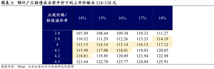 静态看,预计目前平价下广汇转债上市首日获得的转股溢价率在14%-18%区间内,价格114-118元。