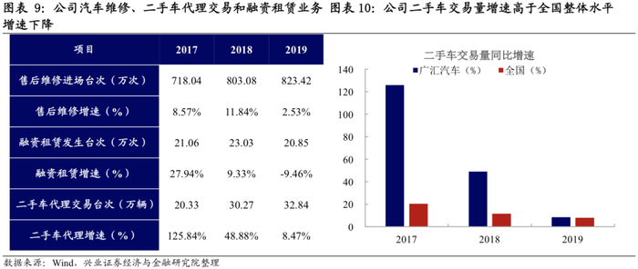 汽车行业整体景气度下降还影响到了公司汽车维修、二手车代理交易业务。2019年公司实现维修 823.42万台次,同比增长2.53%,增速较2018年比大幅下滑;车辆维修单价未见上涨,维持在1890元/次左右。二手车业务方面,虽然二手车交易在2019年下半年呈现单月同环比增速均上升趋势,不过2019年全年7.96%的交易量增速相比于2018年的11.46%下降不少。公司二手车交易量增速高于全国平均水平,具有增长潜力。2020年5月国常会决定将二手车增值税率从2%下降至0.5%,有助于刺激二手车需求总量增长,同时公司积极开拓电商平台,与阿里合作建设一体化二手车交易服务平台,增强业务实力。