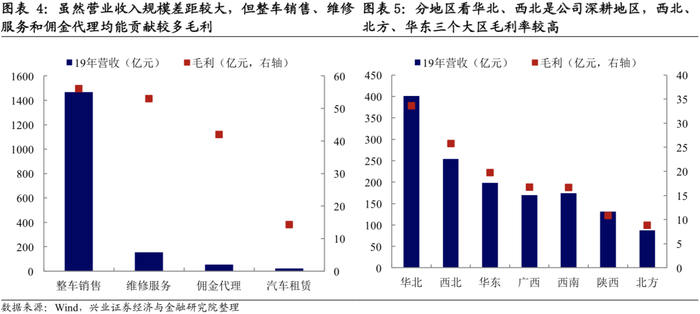截至2019年公司已建立了覆盖全国28个省、自治区及直辖市的汽车经销网络,经销50多个乘用车品牌,运营841个营业网点,包括782家4S店。其中,西北、华北大区贡献核心业绩,西北、北方、华东三个大区毛利率较高。公司主要竞争对手中升集团重点布局全国一线、二线或省会城市,区域聚焦华东及华南。相比之下,广汇汽车更注重于广泛布局,在非一线城市以及华北、西南等地区具有存量优势,并能够依靠较为充足的土地储备拉低门店开设成本,未来扩张潜力较大。