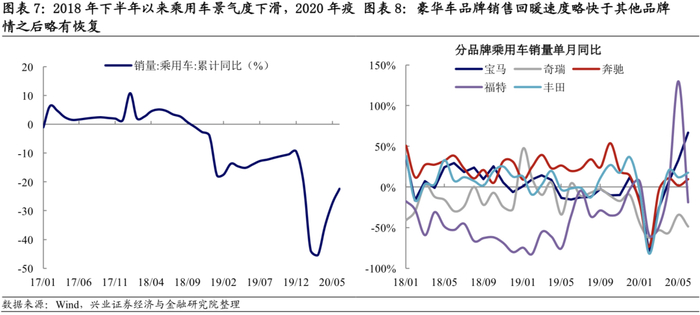 乘用车行业自2018年下半年起景气度下滑,2018年10月乘用车销量累计同比增速转负。2020年行业基本面受到疫情的负面影响,4月起有所起有所恢复。据中汽协数据2020年6月国内乘用车产销179.8万辆和176.4万辆,环比增长8.3%/ 5.4%,同比增长12.2%/1.8%,2020年1月至6月乘用车产销775.4万辆和787.3万辆,同比下降22.5%/22.4%。可以看到的是,2019年豪华品牌(含奔驰、宝马、奥迪等八个品牌)合计销售市场份额继续扩大,累计销售超过220万台,较2018年增长超过11%,同时今年疫情之后,相比于普通品牌宝马、奔驰乘用车销量恢复较快,这也与中汽协解读的“本次疫情影响最大的是低收入人群,而这些本来就是中国品牌的主要受众。疫情之后,换车人群也更多的考虑中高端车,所以中国品牌市占率才会下降”基本符合。结合这一情况,2019年年末公司已布局超豪华、豪华品牌4S店229家,同比增加8家(占比从年初的28.44%提高至29.28%),同时减少了中高端品牌和自主品牌4S店数量,经营策略向超豪华、豪华车辆的综合服务倾斜。