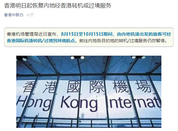 据香港中联办微信公号14日深夜消息,香港机场管理局近日宣布,8月15日至10月15日期间,由内地机场出发的旅客可经香港国际机场转机/过境到其他航点。前往内地各目的地的转机/过境服务仍然暂停。