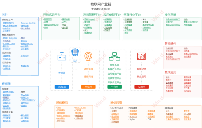 而物联网产业链中,Wind数据显示,将涉及多个大行业,如芯片、传感器、开放式云平台、连接管理平台、应用使能平台、通信模组、通信网络、操作系统、智能硬件等等,长期受益的公司更是众多。