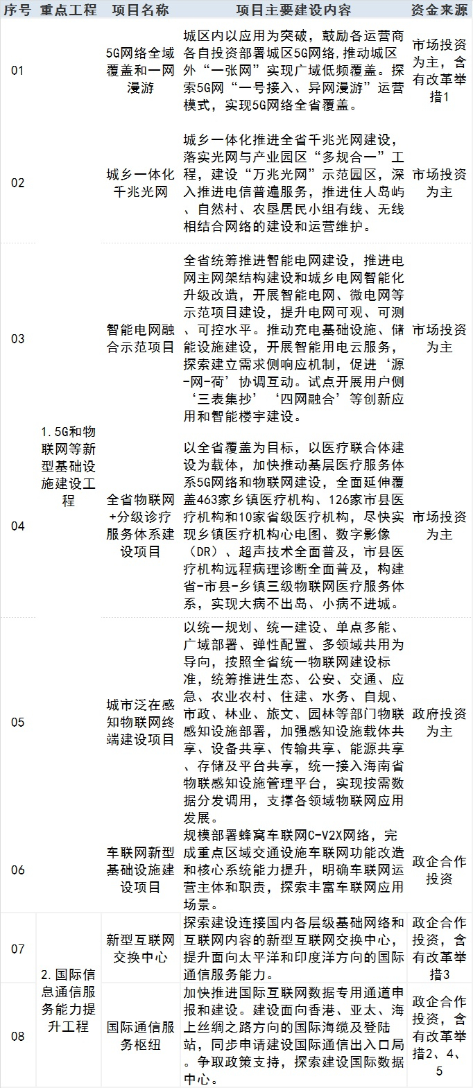 1、5G和物联网等新型基础设施建设工程。涉及推进5G通信网络建设、构建南海区域立体化通信能力、建设高速泛在的基础网络、建设基于物联网的基层医疗机构服务体系、建设工业互联网标识解析体系、布局“空天地海”一体化智能物联体系、部署云边超智能计算基础设施。