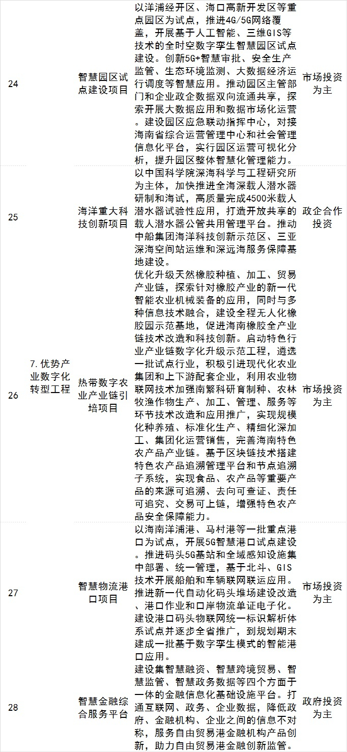 1、优势产业数字化转型工程。涉及以智慧园区为抓手发展新型工业、打造热带特色农业创新基地、推动海洋产业重大科技创新、打造国际港航物流枢纽、壮大国际会展服务业、创新国际化智慧金融服务体系等方面。