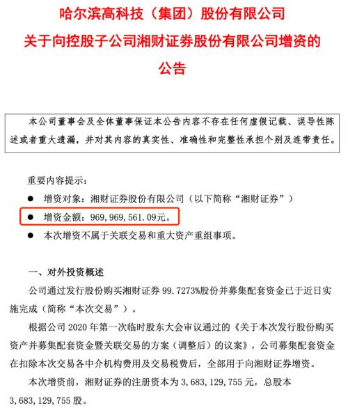 日前,哈高科通过发行股份购买湘财证券 99.7273%股份并募集配套资金已实施完成。根据事先约定,募集配套资金净额9.7亿元,将全部用于向湘财证券增资,增资价格为2.888元每股。