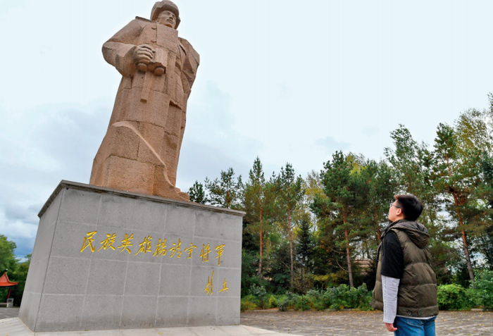 2018年9月5日,吉林省白山市靖宇县杨靖宇将军殉国地,杨靖宇将军曾孙马铖明瞻仰杨靖宇雕像 张楠摄