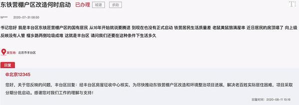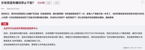 按照人民网留言板中北京市丰台区城市管理监督指挥中心的表述,东铁营棚户区改造项目国有土地上房屋征收工作于2017年9月启动,至2019年7月完成入户摸底调查、搬迁补偿政策制定等相关工作。目前正就搬迁补偿内容征求各相关部门意见。待搬迁补偿政策初步确定后,将在改造范围内广泛征求搬迁居民意见,在政策获得绝大多数居民支持并同意后,启动搬迁相关工作。