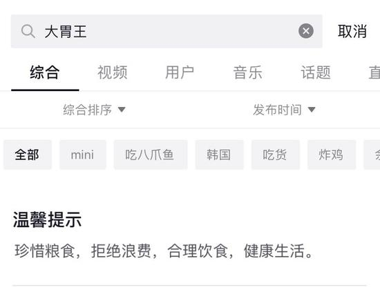 目前,在多家短视频平台搜索“吃播”、“大胃王”关键词,会出现“珍惜粮食,拒绝浪费,合理饮食,健康生活”等提示。