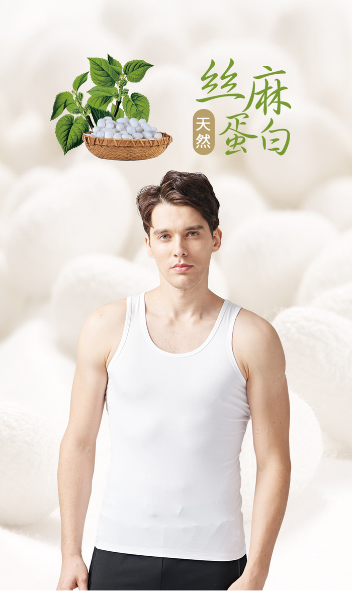 男士的蚕丝蛋白男士背心,富含蚕丝蛋白和17种氨基酸,将蚕丝和麻两种天然的材质,融合在一起,孕育出丝麻的独特触感,高效抗菌,亲肤护肤。