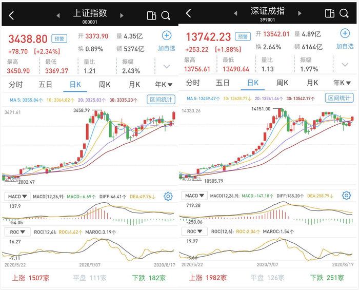 至8月17日收盘,上证综指涨2.34%,报3438.8点;科创50指数涨0.83%,报1496.4点;深证成指涨1.88%,报13742.23点;创业板涨1.04%,报2696.39点。