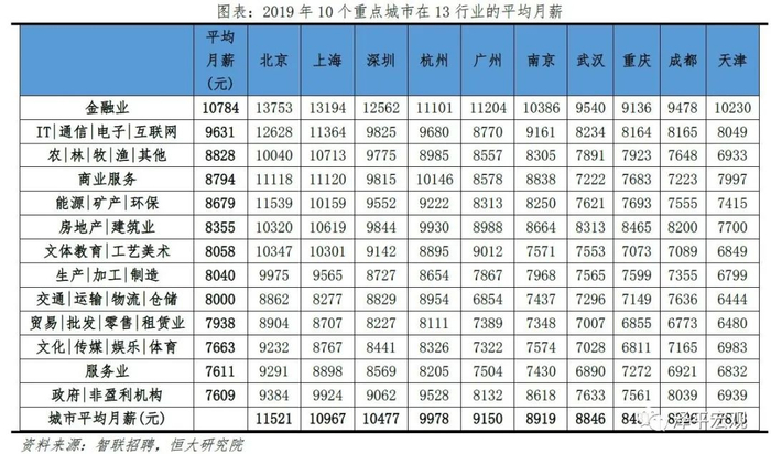 1)杭州:2016-2019年人才净流入占比分别为0.8%、1.0%、1.2%、1.4%,始终为正且逐年攀升,主因杭州以电商为代表的产业发展迅速、薪酬超越广州在十大城市中位列第四。2013-2019年杭州常住人口增量从4万逐渐增至55万,2019年常住人口增量杭州排名全国第一。2016-2019年杭州人才流入占比分别为3.0%、3.3%、3.3%、3.4%,人才流出占比分别为2.2%、2.3%、2.1%、2.0%,人才流入明显大于流出,使得人才净流入占比分别为0.8%、1.0%、1.2%、1.4%,逐年攀升,2018-2019年居全国之首。从来源看,人才向杭州流入的前十大城市分别为上海、北京、深圳、合肥、宁波、郑州、南京、广州、苏州、成都,合计占比达46.6%,明显高于2018年杭州人才前十来源地的44.0%,杭州的人才来源集中度有所上升。其中,来自上海和北京的人才合计占比23.6%,杭州发展所需人才主要在一线城市中,杭州也具有从一线城市抢夺人才的能力。且杭州前十来源地有5个来自长三角地区,合计占比达25.1%。人才流入杭州主要是因为产业发展迅速,尤其以阿里巴巴为代表的电商行业发展较快。根据杭州市统计局,2019年杭州数字经济产业增加值增长15.1%,其中,电子商务产业增加值14.6%,均高于杭州GDP增速6.8%。2019年杭州流入人才28.8%流向IT|通信|电子|互联网行业,明显高于其余9个重点城市,其中,12.8%流向互联网/电子商务二级行业,高于除重庆外的其余8个重点城市。同时杭州薪酬较有吸引力,在十个重点城市中位列第四,高于广州,其中13个行业中杭州有1个位列第一(交通|运输|物流|仓储),1个位列第二,2个位列第三,7个位列第四。从去向看,杭州人才外流的前十大城市分别为上海、北京、宁波、南京、深圳、苏州、嘉兴、绍兴、广州、金华,合计占比达44.9%。其中,有7个去向长三角地区,合计占比达32.3%。