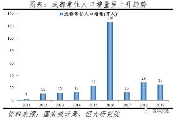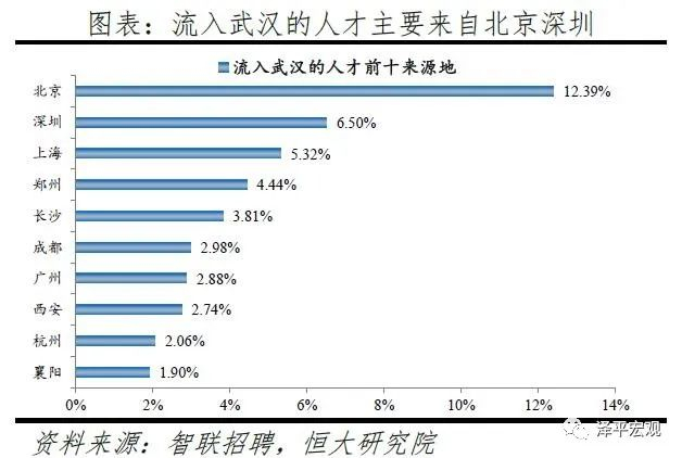 4)武汉:2016-2019年人才净流入占比分别为-0.3%、0.0%、0.8%、0.1%,2017年由负转正,主因“百万大学生留汉”政策实施。2011-2019年武汉常住人口增量平均为16万人,常住人口保持较高增长。2016-2019年武汉人才流入占比分别为2.1%、2.2%、2.7%、1.9%,人才流出占比2.3%、2.1%、1.9%、1.8%,逐年下降,使得人才净流入占比分别为-0.3%、0.0%、0.8%、0.1%。主要因为2017年开始的“百万大学生留汉创业就业工程”,大学生可以低于市场价20%买到安居房或租到租赁房;不满40周岁的留汉大学毕业生可凭毕业证落户,硕士、博士不受年龄限制可直接落户;专科、本科、硕士、博士的指导性最低年薪标准分别为4万元、5万元、6万元、8万元。根据武汉市委组织部,2017-2019年新增留汉大学生共109.5万人,提前两年完成2017年确定的五年达到100万的目标。从来源看,人才向武汉流入的前十大城市分别为北京、深圳、上海、郑州、长沙、成都、广州、西安、杭州、襄阳,合计占比达45.0%。从去向看,武汉人才外流的前十大城市分别为北京、深圳、上海、广州、杭州、长沙、南京、成都、郑州、宜昌,合计占比达45.1%。