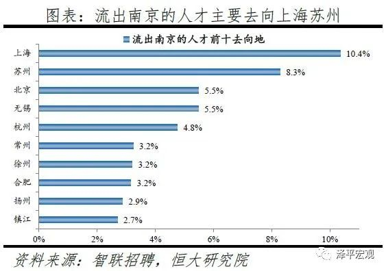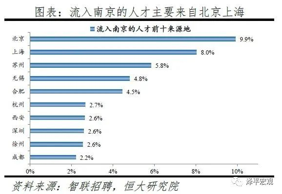 2)南京:2016-2019年人才净流入占比分别为0.8%、0.9%、0.9%、0.9%,始终为正且比较稳定,主因南京发展速度较快且2018年“宁聚计划”实施吸引人才。和上述其他城市相比,南京常住人口增量相对稳定,2011-2019年始终在2-10万区间波动、2019年为6万。2016-2019年南京人才流入占比分别为3.1%、3.0%、2.9%、2.8%,人才流出占比分别为2.3%、2.1%、1.9%、1.9%,均逐年下降,但人才流出明显大于流出,使得南京人才净流入占比分别为0.8%、0.9%、0.9%、0.9%,基本稳定。主要因为落户条件放宽且电子通信、制造业等行业增长速度较快。2018年“宁聚计划”即《人才落户实施办法》实施,不再以就业为落户前提,年龄条件也从35岁放宽到40岁。根据各市统计局数据,2019年南京GDP同比增长7.8%,不仅高于全国的6.1%,也在十大重点城市中排名第一;2018年南京规模以上工业增加值同比增长7.8%,高于全国的6.2%,其中,新能源汽车、工业机器人、集成电路产量分别增长253.1%、108.9%、29.6%,高于全国的66.2%、6.4%、11.2%。从来源看,人才向南京流入的前十大城市分别是北京、上海、苏州、无锡、合肥、杭州、西安、深圳、徐州、成都,合计占比达45.7%。其中,有5个是长三角地区,合计占比达25.8%。从去向看,南京人才外流的前十大城市分别为上海、苏州、北京、无锡、杭州、常州、徐州、合肥、扬州、镇江,合计占比达49.5%。其中,有8个是长三角地区,合计占比达40.8%。南京和长三角的人才互动非常频繁,部分因为南京高校较多,长三角人才为求学向南京集聚,毕业后从南京回流至长三角其他城市。根据教育部数据,南京普通高校数、211高校数分别为34、10所,分别排名第6、3名。
