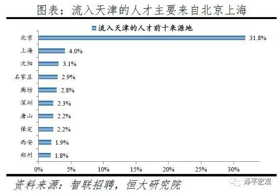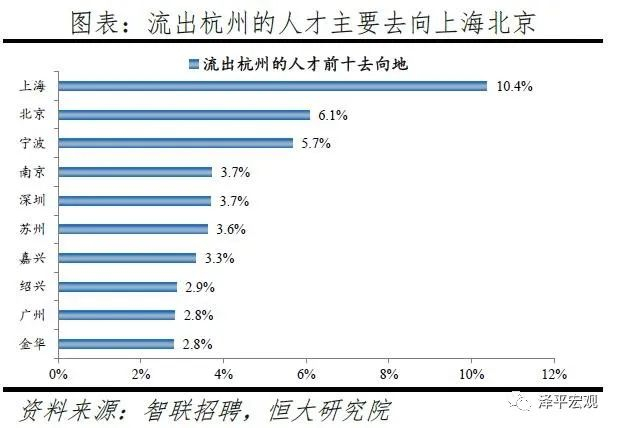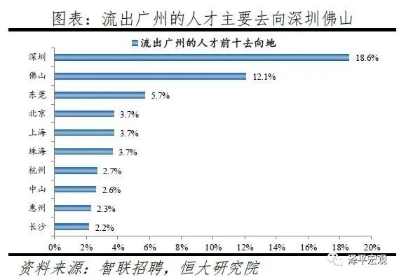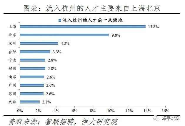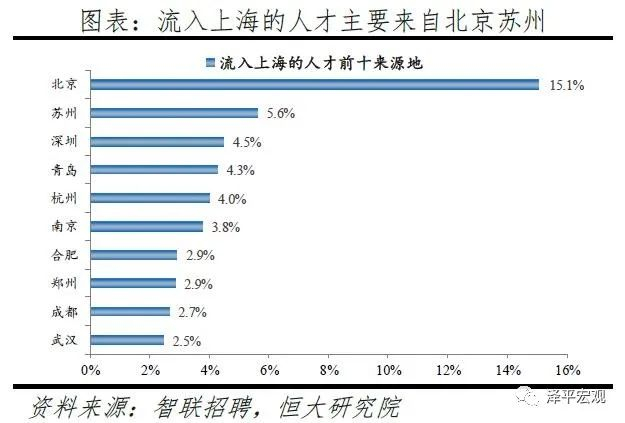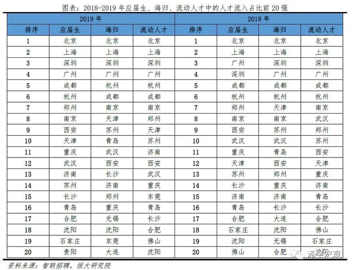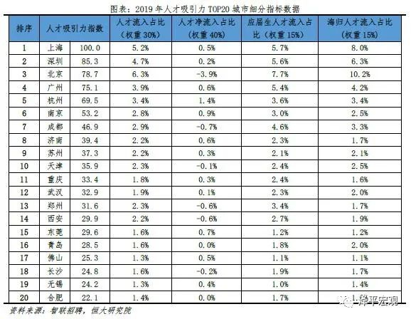 3)深圳:2016-2019年人才净流入占比分别为-0.2%、0.1%、0.4%、0.2%,主因深圳经济发展速度较快、人才政策有吸引力;深圳和广州互为人才外流第一目标城市,深圳流向广州和广州流向深圳的人才流出在全国流动人才总量中占比分别为0.7%、0.6%,规模基本平衡。2015年深圳常住人口增量从2014年的15万大幅上升至60万,2015-2018年平均增量为56万。2016-2019年深圳人才流入占比基本稳定在4.9%左右,分别为4.8%、5.1%、5.0%、4.7%,但人才流出占比呈下降趋势,分别为5.0%、4.9%、4.6%、4.6%。从来源看,人才向深圳流入的前十大城市分别为广州、北京、天津、东莞、上海、成都、长沙、武汉、惠州、佛山,合计占比达52.8%,高于2018年前十来源地的50.4%,深圳的人才来源集中度有所提高。其中,珠三角城市有4个,占比22.9%;流入深圳的人才中13.1%来自广州,流入广州的人才中17.4%来自深圳,深圳和广州互为人才来源城市的第1位。人才流入深圳主要因为经济发展速度相对较快和人才政策有吸引力。2019年深圳GDP增速6.7%,高于全国平均的6.1%,也高于北京和上海的6.1%、6.0%;2016-2019年深圳平均GDP增速为8.0%,高于广州、北京、上海的7.0%、6.6%、6.6%。深圳还拥有华为、腾讯、平安等众多著名企业,尤其是互联网企业,吸引大量人才。深圳的落户政策逐渐放宽,且补贴幅度较大,根据深圳市人力资源和社会保障局数据,2016年深圳将全日制本科生、硕士、博士的租房相关补贴从6000、9000、12000元分别提高至15000、25000、30000元,2017年落户门槛放宽至35岁以下专科学历人才,对新引进的两院院士和杰出人才、地方级领军人才、后备级人才分别给予300万、200万、160万的奖励。从去向看,深圳人才外流的前十大城市分别为广州、东莞、上海、北京、惠州、佛山、长沙、杭州、武汉、成都,合计占比达53.9%,低于2018年前十去向地的56.4%,深圳人才流向的方向更加分散。其中,广州占比达15.0%,珠三角城市有4所,合计占比32.3%,深圳和珠三角地区人才流动频繁;流出深圳的人才中15.0%流向广州,流出广州的人才中18.6%流向深圳,深圳和广州互为人才外流目标城市的第1位,深圳流向广州和广州流向深圳的人才流出在全国流动人才总量中占比分别为0.7%、0.6%,规模基本平衡。