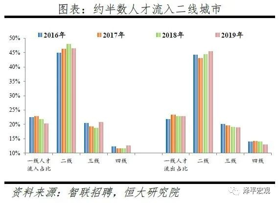 2)分线城市看,2019年一线、二线、三线、四线人才净流入占比分别为-2.7%、1.1%、1.8%、-0.3%,2018年分别为-0.9%、4.9%、-0.3%、-2.3%,结合近4年数据观察,一线因京沪控人持续流出,二线人才持续集聚,三线较为平衡,四线持续流出。我们把全国296个地级及以上建制市划分为一二三四线城市,其中,一线城市为北上广深4个,二线城市35个,三线城市81个,四线城市176个(详见恒大研究院2019年4月报告《中国城市发展潜力排名:2019》)。从人才流入流出占比看,2016-2019年一线城市人才流入占比呈下降趋势,人才流出占比基本稳定;二线城市人才流入占比分别为44.9%、46.3%、47.9%、46.4%,呈上升趋势且约半数人才流入二线城市,人才流出占比基本稳定;三线城市人才流入占比分别为20.5%、19.3%、18.6%、20.8%,2019年上升较为明显,人才流出占比逐年下降;四线城市人才流入占比分别为12.2%、11.6%、11.6%、12.6%,2019年上升较为明显,人才流出占比呈下降趋势。从人才净流入占比看,2016-2019年一线分别为0.8%、-0.5%、-0.9%、-2.7%,受京沪控人影响一线人才净流入占比逐年下降,2017年开始由正转负;二线分别为0.6%、3.2%、3.6%、1.1%,二线人才持续集聚;三线分别为0.4%、-0.3%、-0.3%、1.8%,较为平衡;四线分别为-1.8%、-2.5%、-2.3%、-0.3%,人才持续净流出。