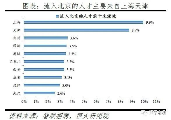 1)北京:2016-2019年人才净流入占比分别为-0.7%、-2.3%、-2.7%、-3.9%,持续为负且降幅扩大,主因北京严控人口、疏解产业;北京和上海互为人才外流第一目标城市,北京流向上海、上海流向北京的人才流出在全国流动人才总量中占比分别为0.8%、0.6%,人才从北京净流向上海。北京常住人口增量逐年下滑,2011-2018年从57万降至-17万,2019年缩窄至-1万,2017-2019年连续3年为负,2016-2019年北京的常住人口增量始终在一线城市中最低。2016-2019年北京人才流入占比分别为7.2%、7.3%、7.1%、6.3%,但人才流出占比持续攀升,分别达7.9%、9.6%、9.9%、10.2%,北京的人才流入和人才流出均居全国城市首位,但流出逐年攀升、流出明显大于流入,使得人才净流入占比分别为-0.7%、-2.3%、-2.7%、-3.9%。从来源看,2019年人才向北京流入的前十大城市分别为上海、天津、郑州、深圳、廊坊、石家庄、西安、成都、沈阳、武汉,合计占比达44.7%。其中,京津冀城市有3个,合计占比达15.6%。人才流入北京主要因为北京经济体量大、薪酬水平高,2019年GDP规模达到3.5万亿,仅次于上海、排名第二,同时13个行业中北京有8个的薪酬位于所有城市之首。从去向看,北京人才外流的前十大城市分别为上海、天津、深圳、成都、廊坊、济南、杭州、广州、石家庄、西安,合计占比达42.5%。其中,流出北京的人才中7.7%流向上海,流出上海的人才中13.1%流向北京,北京和上海互为人才外流目标城市的第1位,北京流向上海和上海流向北京的人才流出在全国流动人才总量中占比分别为0.8%、0.6%,人才从北京净流向上海。流出北京的人才增多主要因为北京控制人口、疏解产业。2013年北京开始严控人口,2015年发布的《京津冀协同发展规划纲要》要求北京外迁非首都核心功能,2020年及之后北京常住人口控制在2300万人以内。根据北京市发改委,截至2019年底,北京市不予办理的工商登记业务累计达2.28万件;2014-2019年北京市退出一般制造业企业2759家,疏解提升市场631个、物流中心122个。根据国家统计局数据,2014-2018年北京规模以上工业企业单位数累计减少489家。2019年北京流出人才的29.7%来源于IT|通信|电子|互联网行业,高于除深圳外的其他8个重点城市,也高于北京流入人才流向该行业的比例23.4%。
