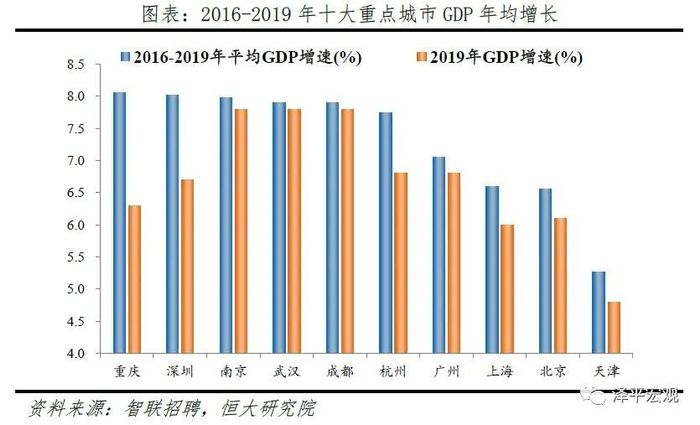 从重点城市看,我们选取十大最具发展潜力城市(深圳、北京、上海、广州、成都、南京、武汉、重庆、天津、杭州)作为观察对象,并根据一二线城市对其划分进行具体分析(详见恒大研究院2019年5月报告《中国十大最具发展潜力城市排名:2019》)。