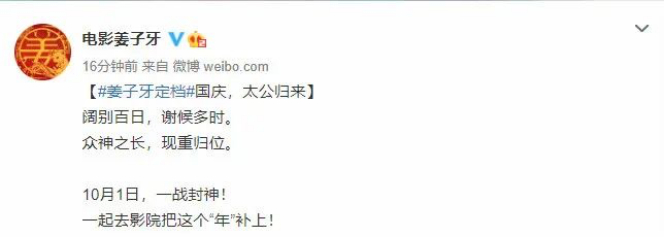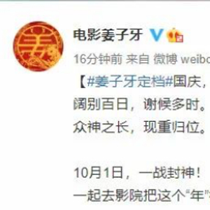随着影院的复工,此前万众期待的贺岁大片们也陆续复出。8月16日,电影《姜子牙》官方微博称,该片定档10月1日。影片将由程腾、李炜共同执导,讲述被贬下凡的姜子牙寻回自我的故事。