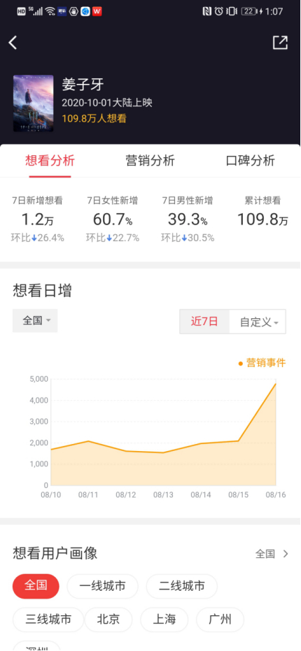 猫眼专业版数据显示,目前有109万人想看《姜子牙》。