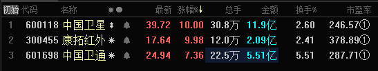 受消息刺激,中国卫星、康拓红外开盘快速涨停,中国卫通涨超7%。