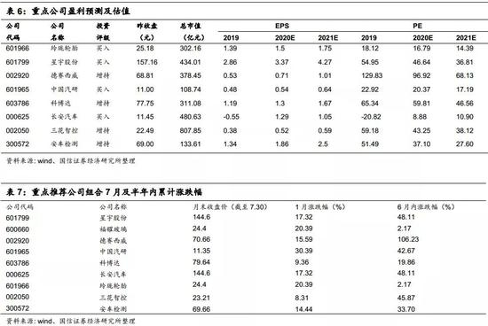 重点关注公司中,2020年7月,乘用车板块,比亚迪、吉利汽车、长安汽车分别上涨18.93%、33.61%、0.64%,江淮汽车下跌2.54%;商用车板块,中国重汽上涨了17.02%;零部件板块,汽车智能化标的德赛西威、保隆科技、宁波高发以及新能源及特斯拉产业链标的三花智控、银轮股份以及拓普集团等涨幅明显,德赛西威涨幅15.59%,银轮股份涨幅21.08%,三花智控涨幅23.21%,宁波高发涨幅23.40%,拓普集团涨幅16.64%,岱美股份涨幅18.92%,新坐标涨幅17.08%;汽车服务板块,安车检测涨幅69.66%,易鑫集团涨幅1.97%。