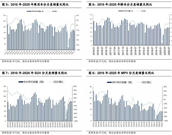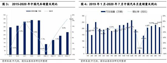 2020年7月国内汽车销量211.2万辆,同比增长16.4%,环比下降8.2%。2020年1-7月,汽车产销分别完成1231.4万辆和1236.5万辆,同比分别下降11.8%和12.7%,降幅持续收窄,总体表现好于预期,预计2020年全年汽车销量下滑幅度有望收窄到-10%以内。短期看,我们认为随着7月国内车企在全面复工基础上逐渐恢复产能,同时前期抑制需求也得到释放,叠加各地购车优惠政策的推出,国内汽车供需逐渐回升,终端销售有望持续回暖。长期看,我们认为国内汽车行业目前仍然处于的是成长期向成熟期过渡阶段,后期有望长期维持正增长。