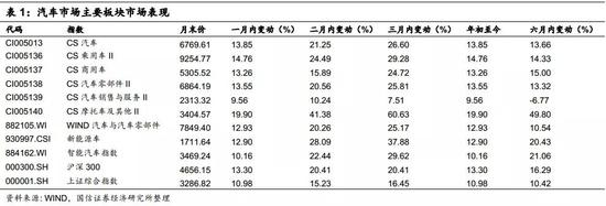 7月CS汽车板块上涨13.85%;CS汽车销售与服务板块上涨9.56%,CS商用车板块上涨13.26%,CS乘用车板块上涨14.76%,CS汽车零部件板块上涨13.55%,CS摩托车及其他板块上涨19.90%,新能源汽车板块上涨12.90%,同期沪深300指数和上证综合指数分别上涨13.30%和10.98%。