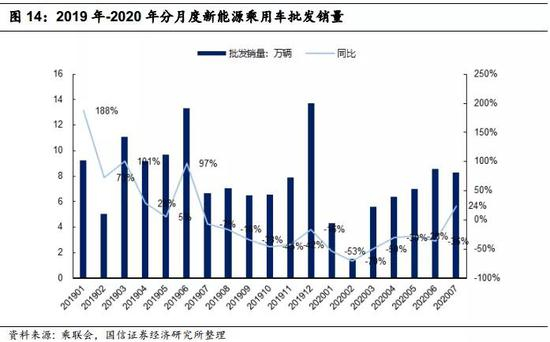 根据乘联会细分数据,2020年7月,新能源乘用车批发销量8.3万辆,同比增长28.3%。拆分品类来看,其中插电混动销量1.6万辆,同比下降7%。纯电动的批发销量6.7万辆,同比增长37%。7月电动车高端化趋势明显,特斯拉以1.1万辆仍保持纯电第一,但比亚迪新能源总体销量达到1.4万辆,回归新能源第一。