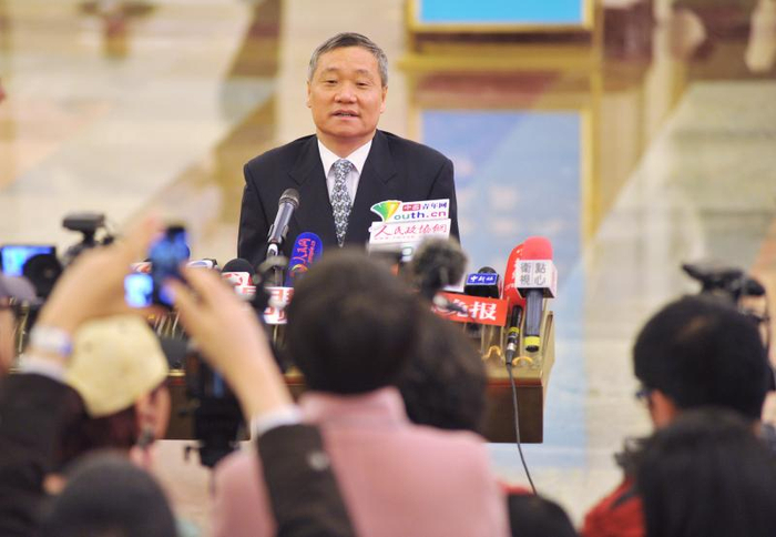 2015年3月12日,全国两会期间,在人民大会堂北大厅的“部长通道”,中国证监会主席肖钢接受采访。来源:视觉中国