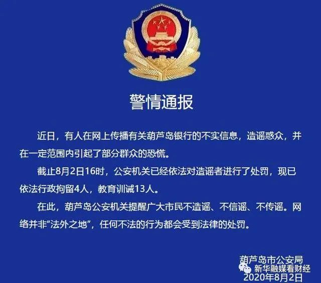 对此,葫芦岛银行在官网表示,该行及各营业网点是经中国银行保险监督管理委员会批准设立的合法金融机构。目前经营正常稳定,资金充裕,完全能够保证储户正常提款需求。同日,葫芦岛市公安局也进行了通报,截至8月2日,对4位造谣者行拘,对13位造谣者进行了教育训诫。